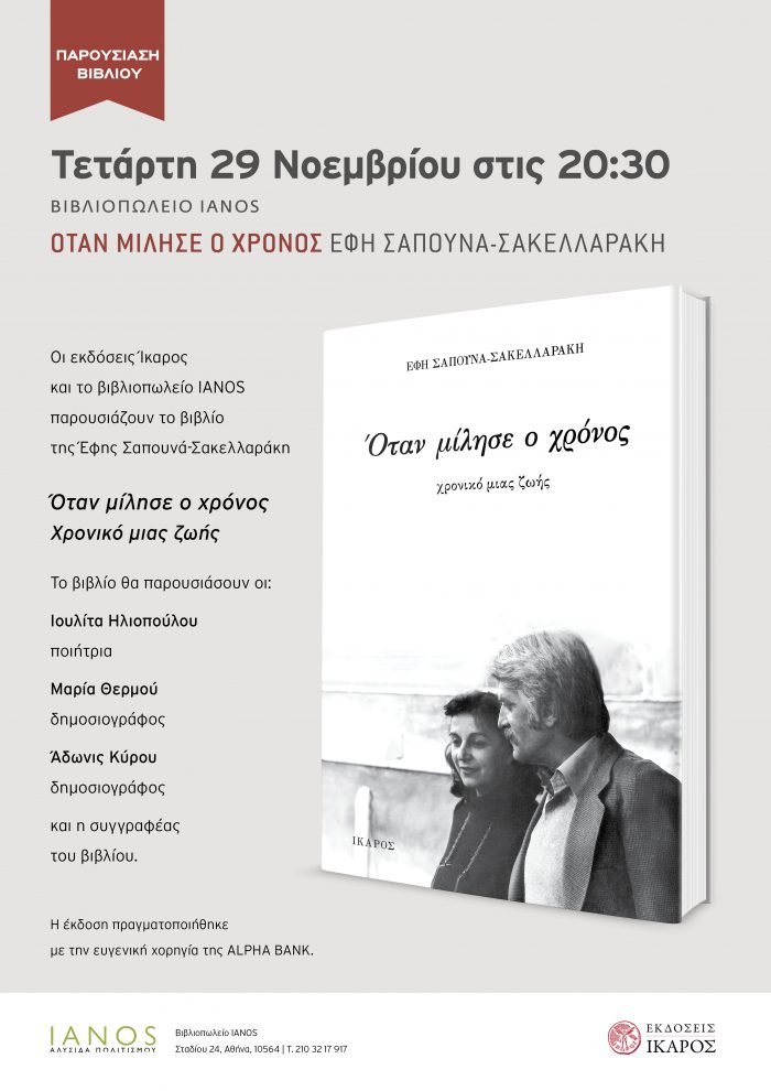 Την Τετάρτη 29 Νοεμβρίου στις 20:30 οι εκδόσεις Ίκαρος και το βιβλιοπωλείο IANOS παρουσίασαν το βιβλίο της Έφης Σαπουνά-Σακελλαράκη Όταν μίλησε ο χρόνος.